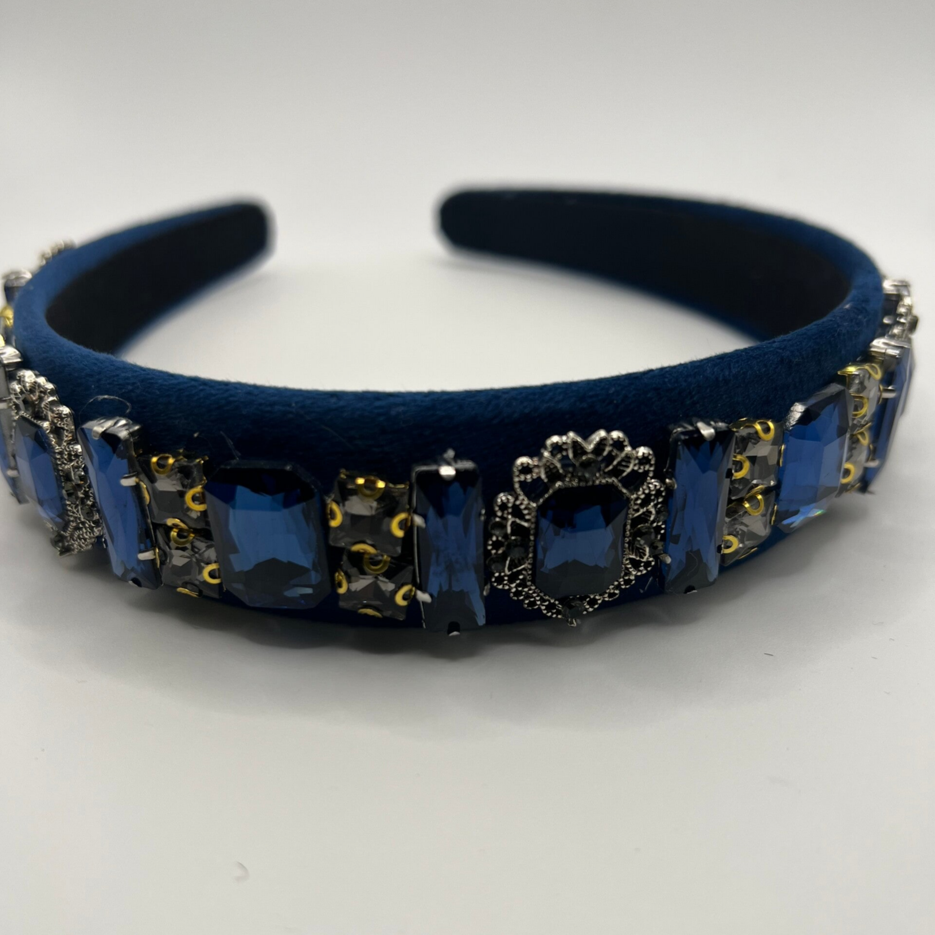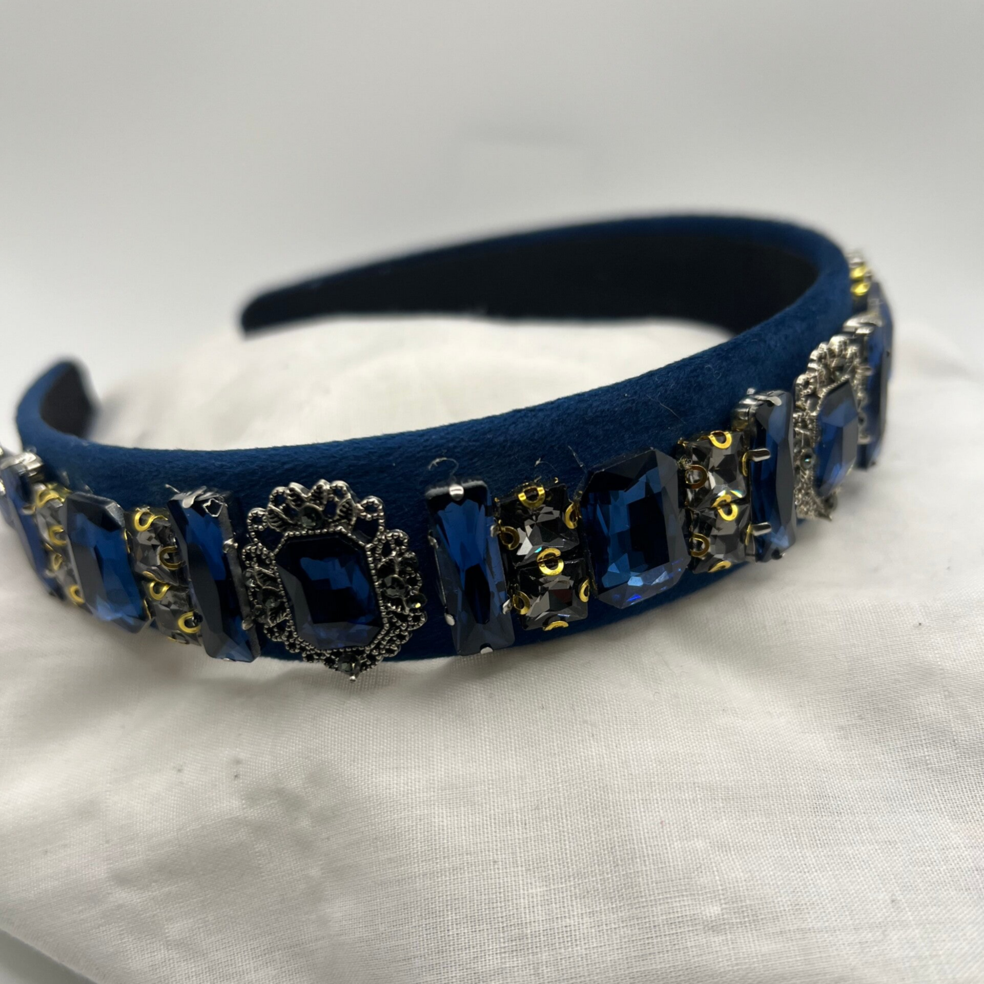 Bijou de tête en velour bleue avec des pierre bleue et gris